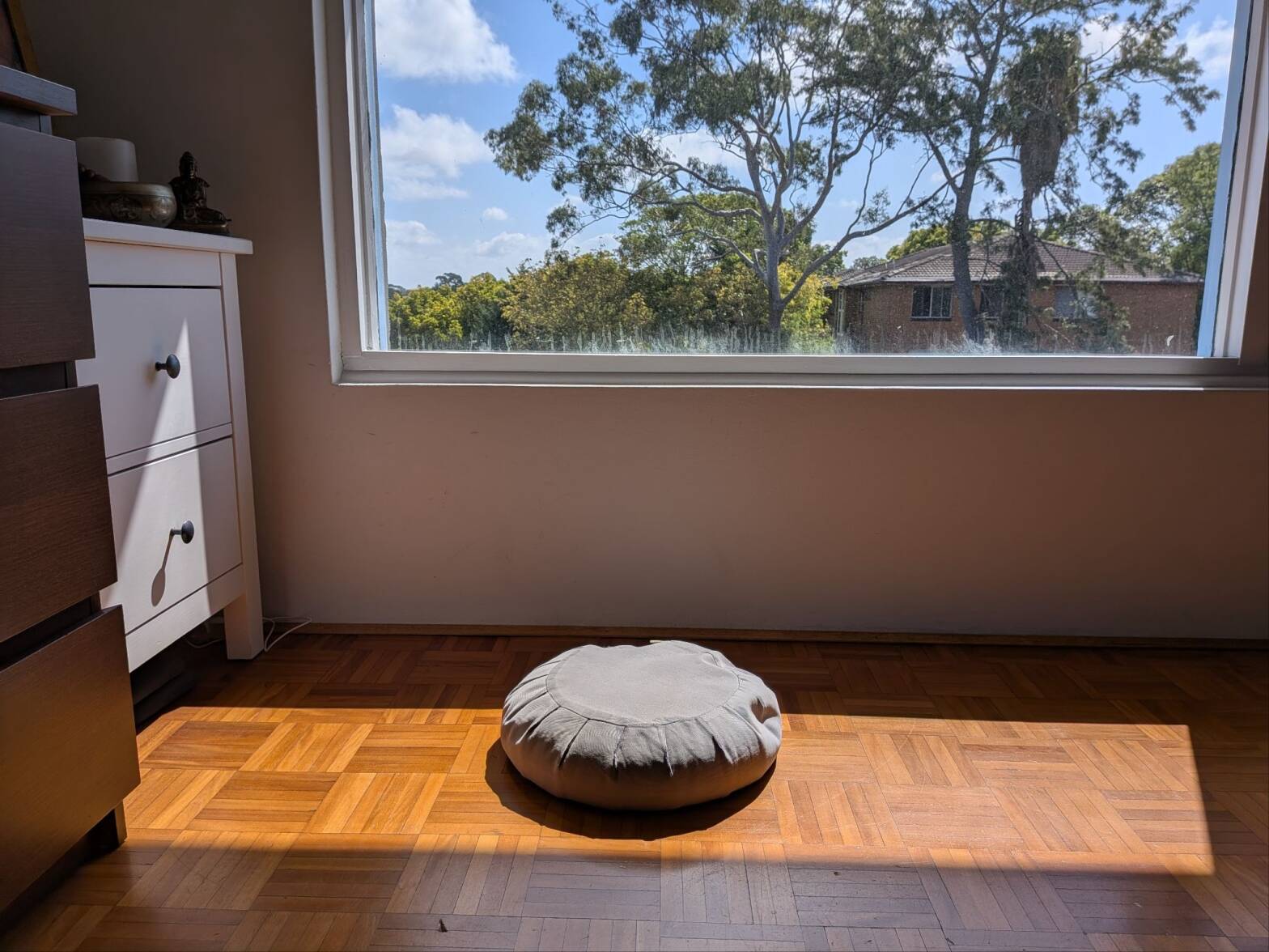 One morning a few months later I’m sitting on a cushion, this time on parquet flooring. I observe the sensations of the body and the breath. I watch thoughts about my unfinished thesis chapter, what to cook for dinner, an idea for an artwork. There’s a gentle sense of calm and comfort. The bell goes off after 45 minutes and I open my eyes to a soft light angled in through the apartment window. I take a moment to appreciate the warmth of the rays in the cool air. I realise that I’m just…fine. It’s another day and my mind isn’t a bad place to be.
