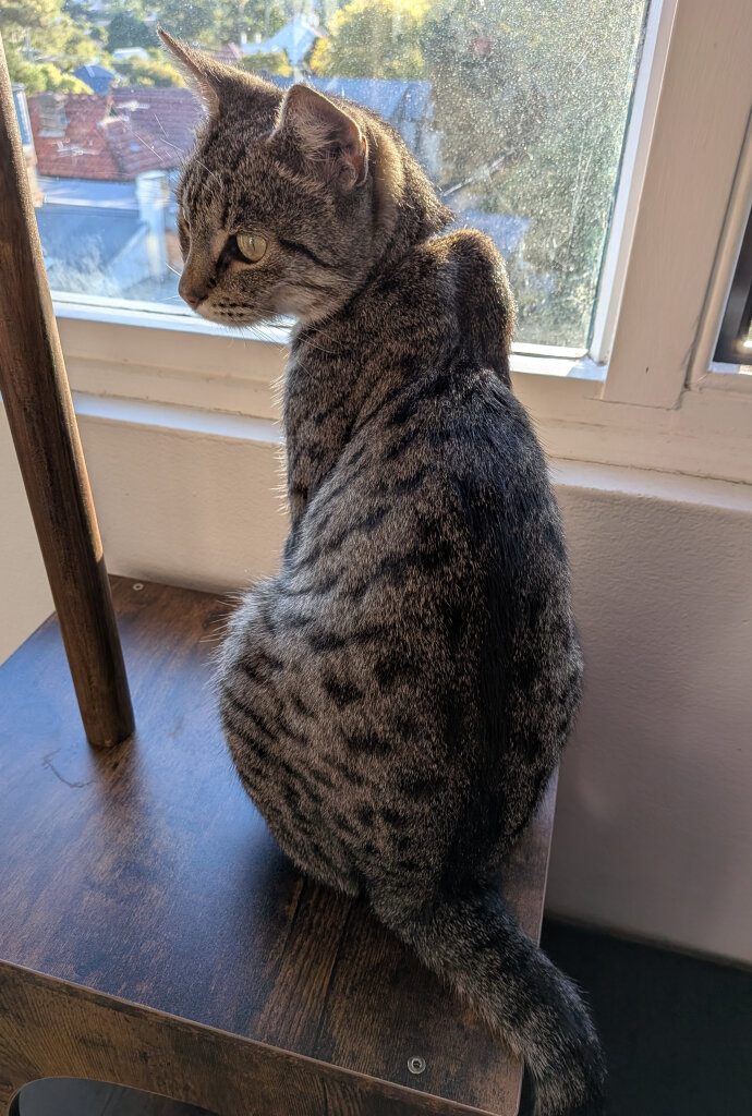 Mimi is vicious when pouncing on a bee soft toy; tender when snuggling to be brushed. She closes her eyes and nudges her head towards the window to smell the outside air. She perches on a shelf and watches us go about our busyness. I bow to her while blinking slowly, doing my best to communicate love and safety.